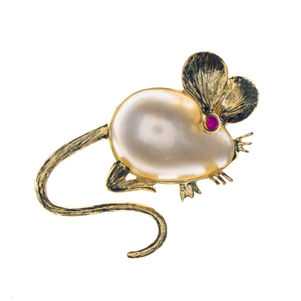 - 14K Yellow Gold Mabe Pearl Ruby Mouse Pendant