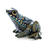 Pale green is the background color for this incredibly detailed frog sculpture. Jon Stuart Anderson's Fioré sculpture is beautifully designed, with intricate repeating patterns covering its surface. The patterns are crafted in polymer clay, then sliced and applied by hand to form the finished design. Crisp colors and expressive shapes complete this stunning Fioré iguana sculpture.
